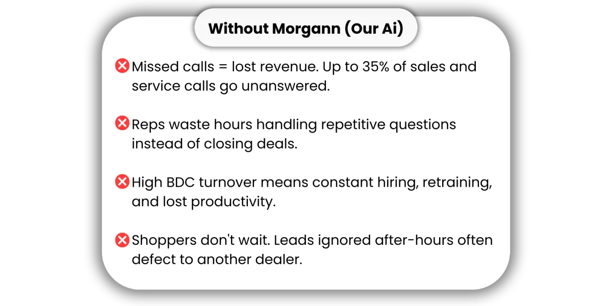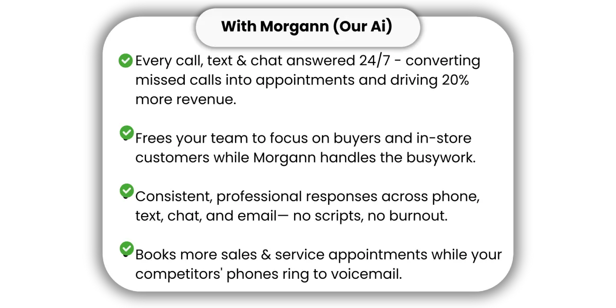Built by dealer owners and salespeople, Morgann from 360 Auto Ai replies in seconds, follows up for months, and books appointments 24/7-so your team can stop chasing and start closing.